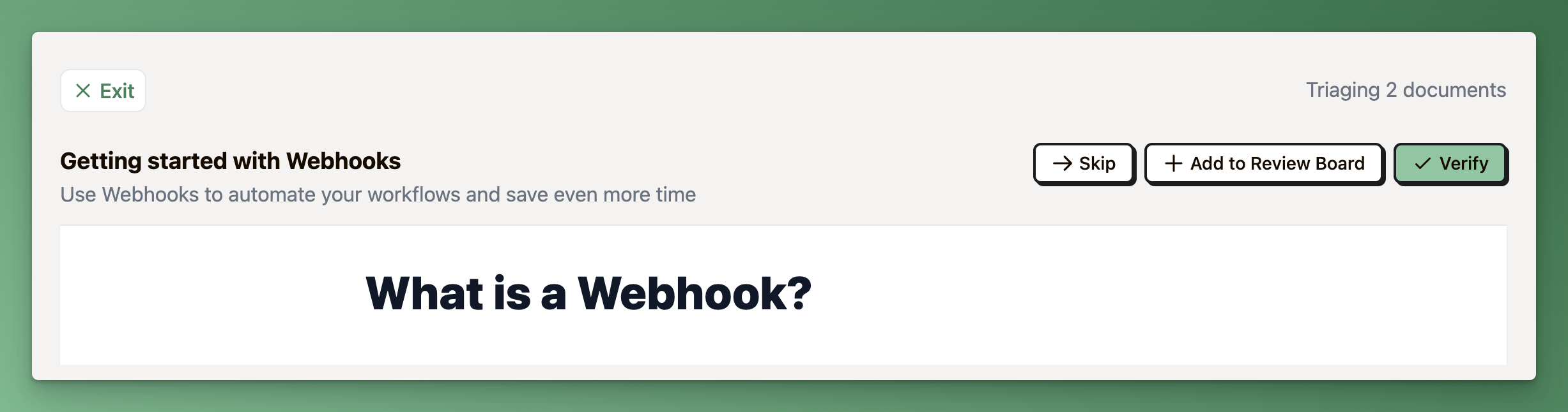 Click Triage and quickly sift through 10 documents at a time. We'll pick the most highly viewed, least recently verified documents first.