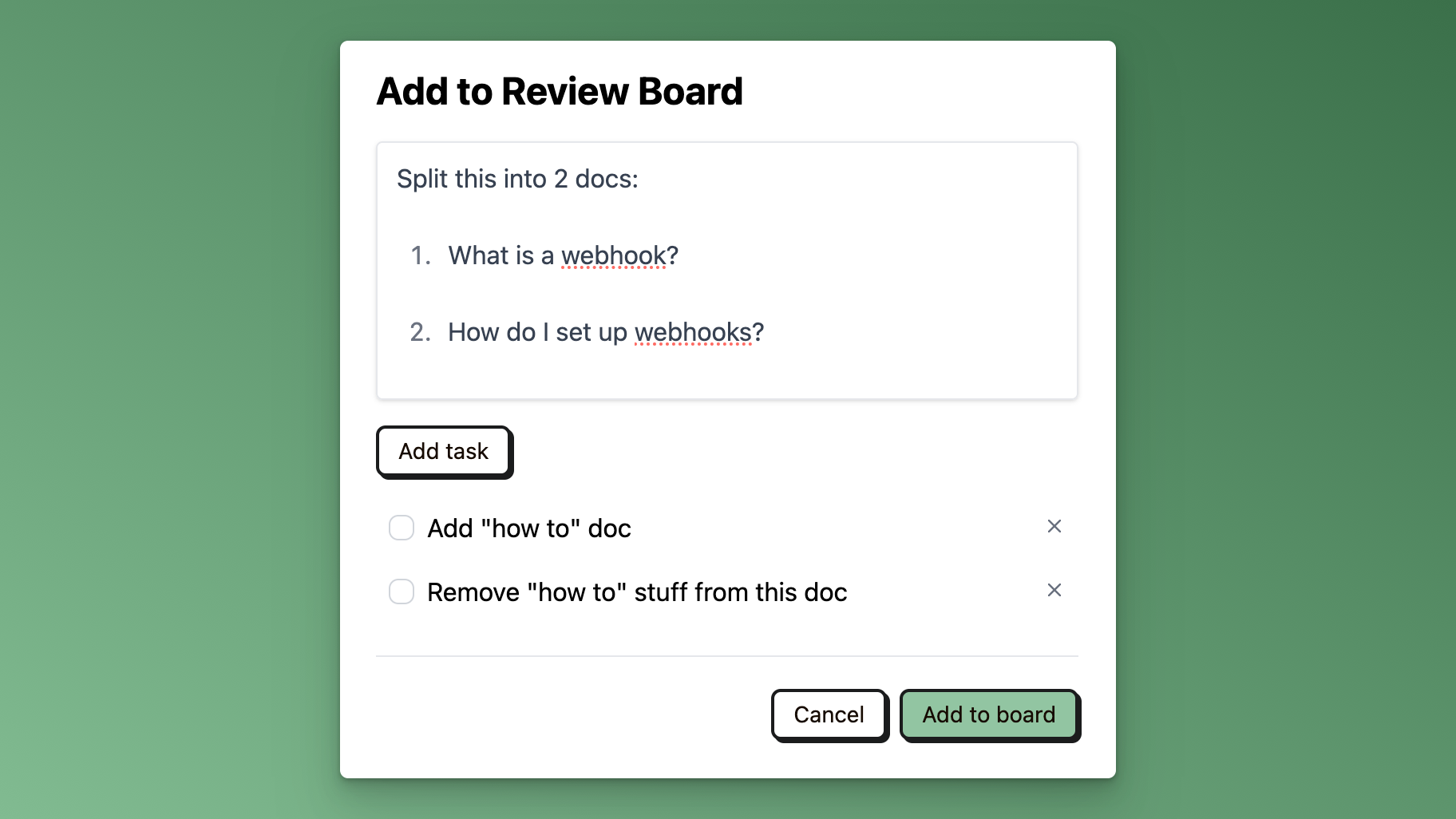 When you add a document to the review board, you can add notes and tasks to help you track what needs to be updated.