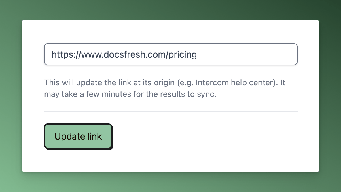 Got some broken links that need fixing? Soon, you'll be able to edit links directly on the Links page. When you change a link in Docs Fresh, we'll automatically update it in your help center, making link maintenance a breeze.